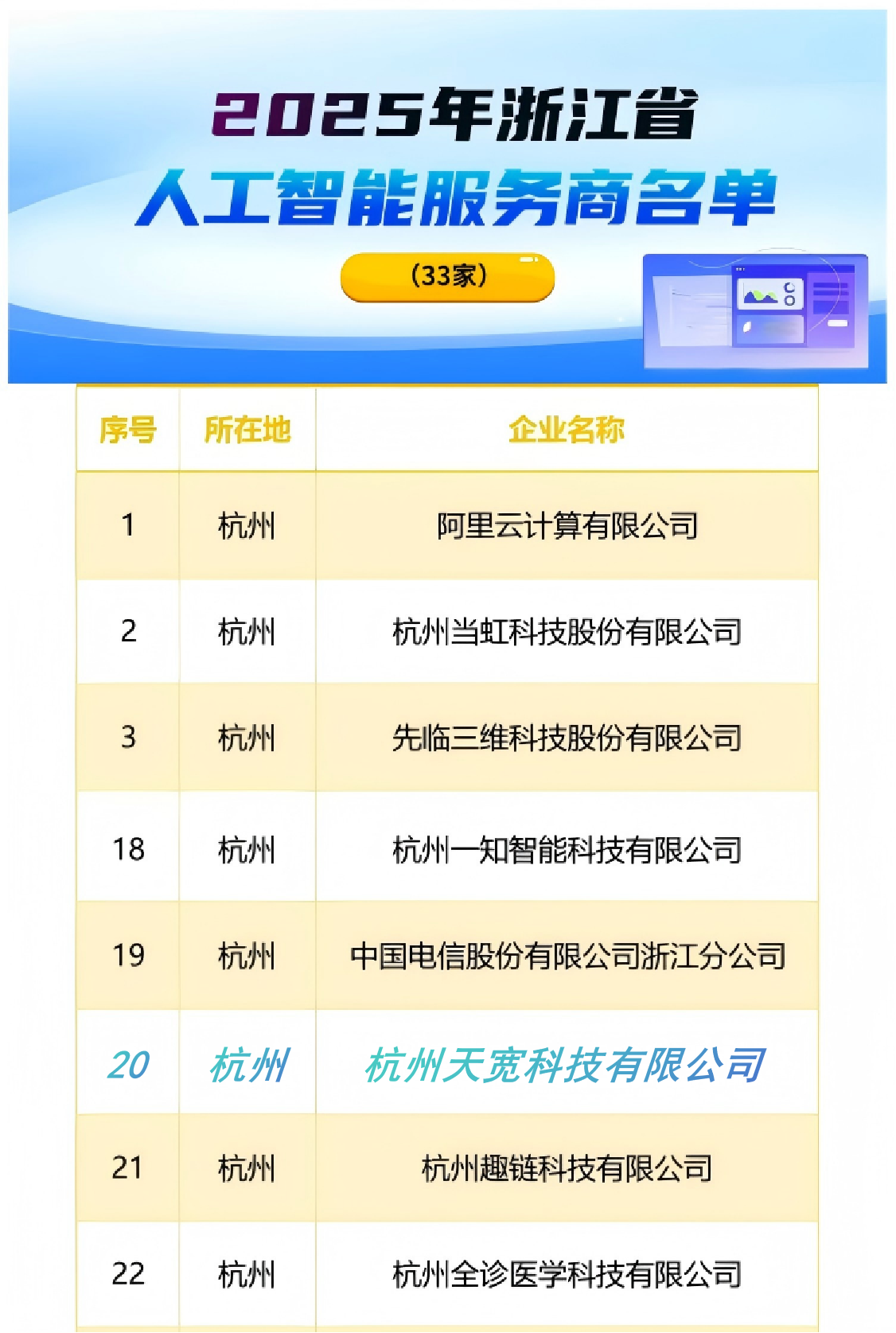 本次遴選工作緊密圍繞國務院“人工智能+”行動的戰(zhàn)略部署,旨在全面推進人工智能賦能新型工業(yè)化,加速創(chuàng)新應用,為產業(yè)深度轉型與高質量發(fā)展注入核心驅動力。值得注意的是,“浙江省人工智能服務商”作為省級權威榮譽,評選標準極為嚴格,本次最終入選企業(yè)僅33家,其中不乏阿里云等頭部民營企業(yè)以及傳播大腦、浙江電信、華數(shù)等大型國有企業(yè),本次天寬科技入選,是長期深耕AI產業(yè)、致力于破解行業(yè)應用難題的實力印證。